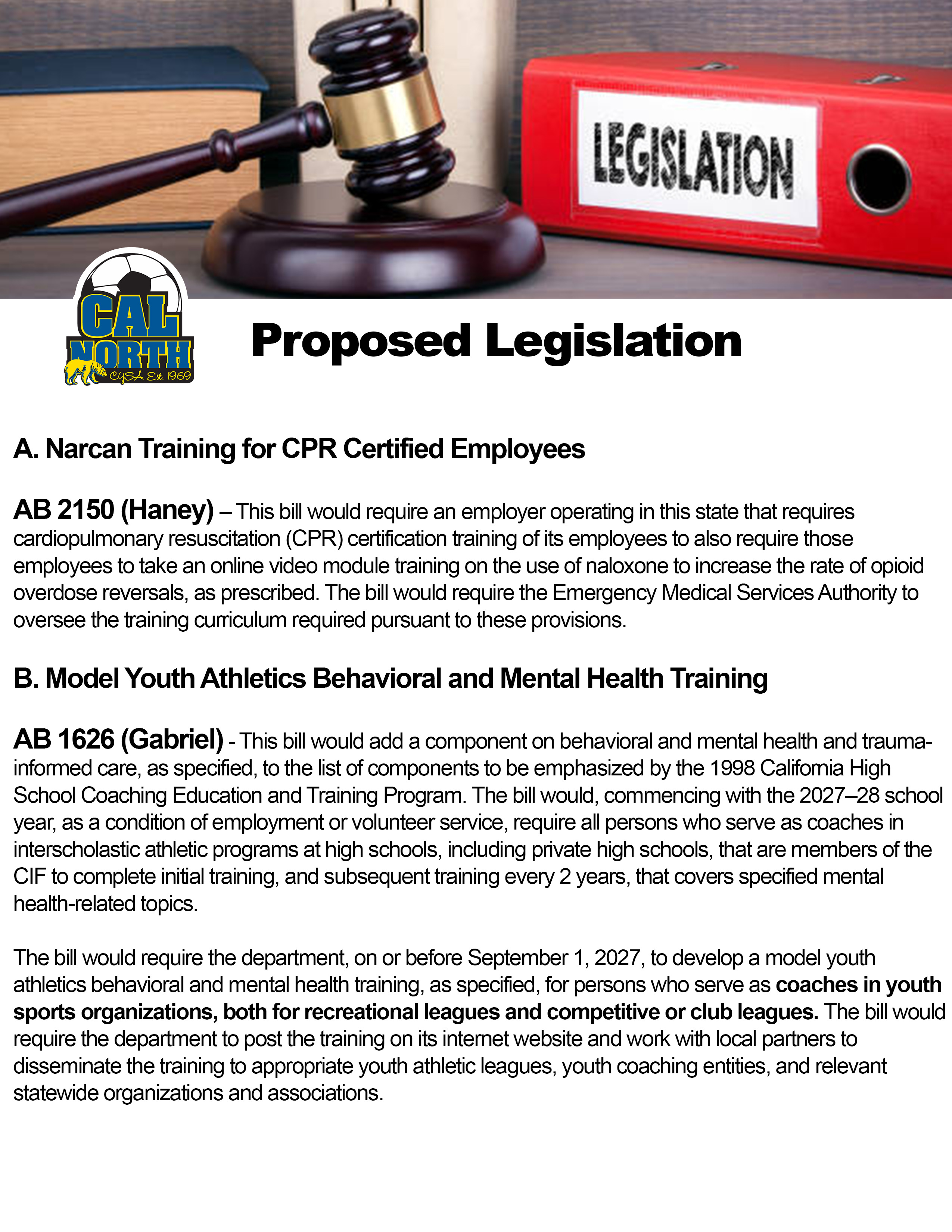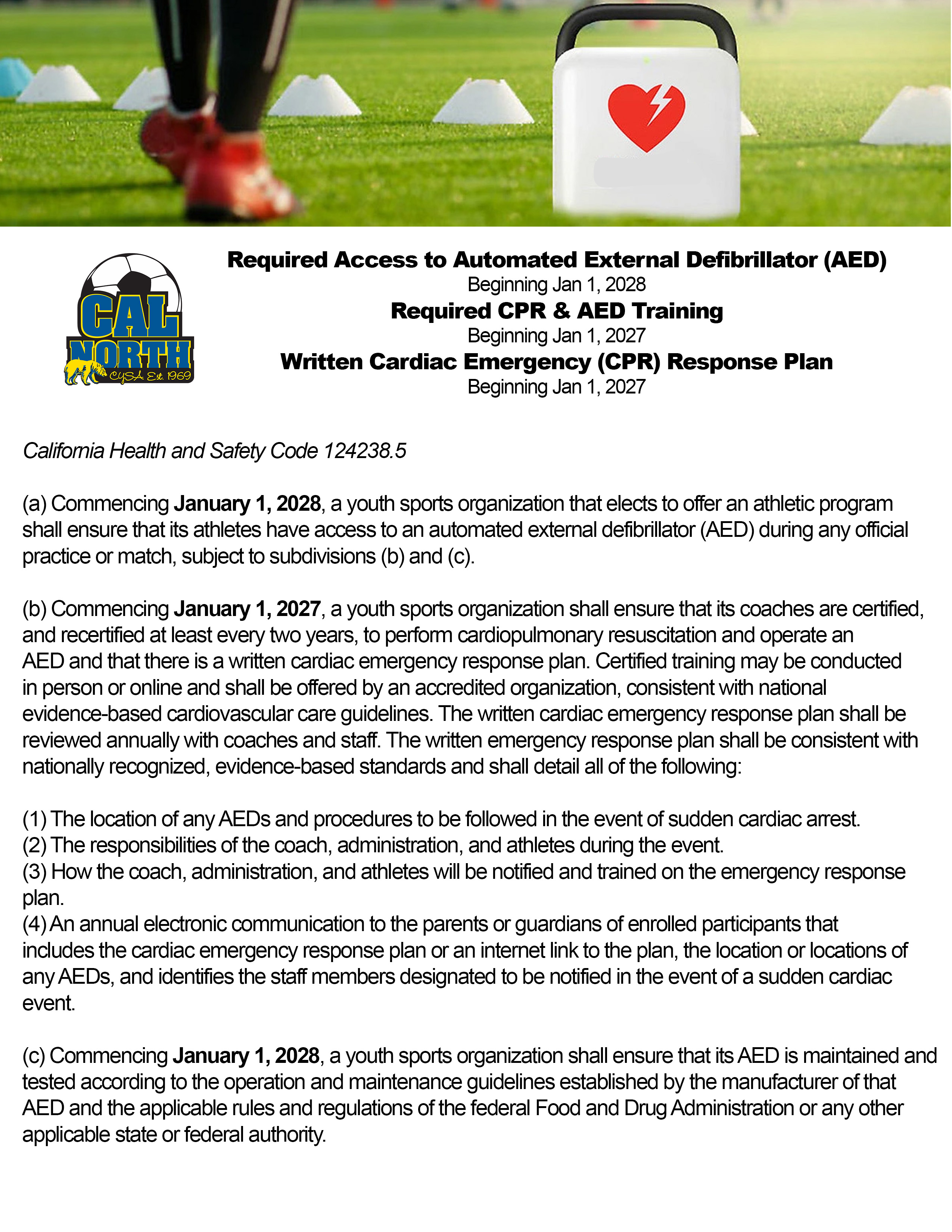 Starting January 2027, there will be legislation taking effect for youth sports organizations in regards to CPR & AED. See infographic for reference.