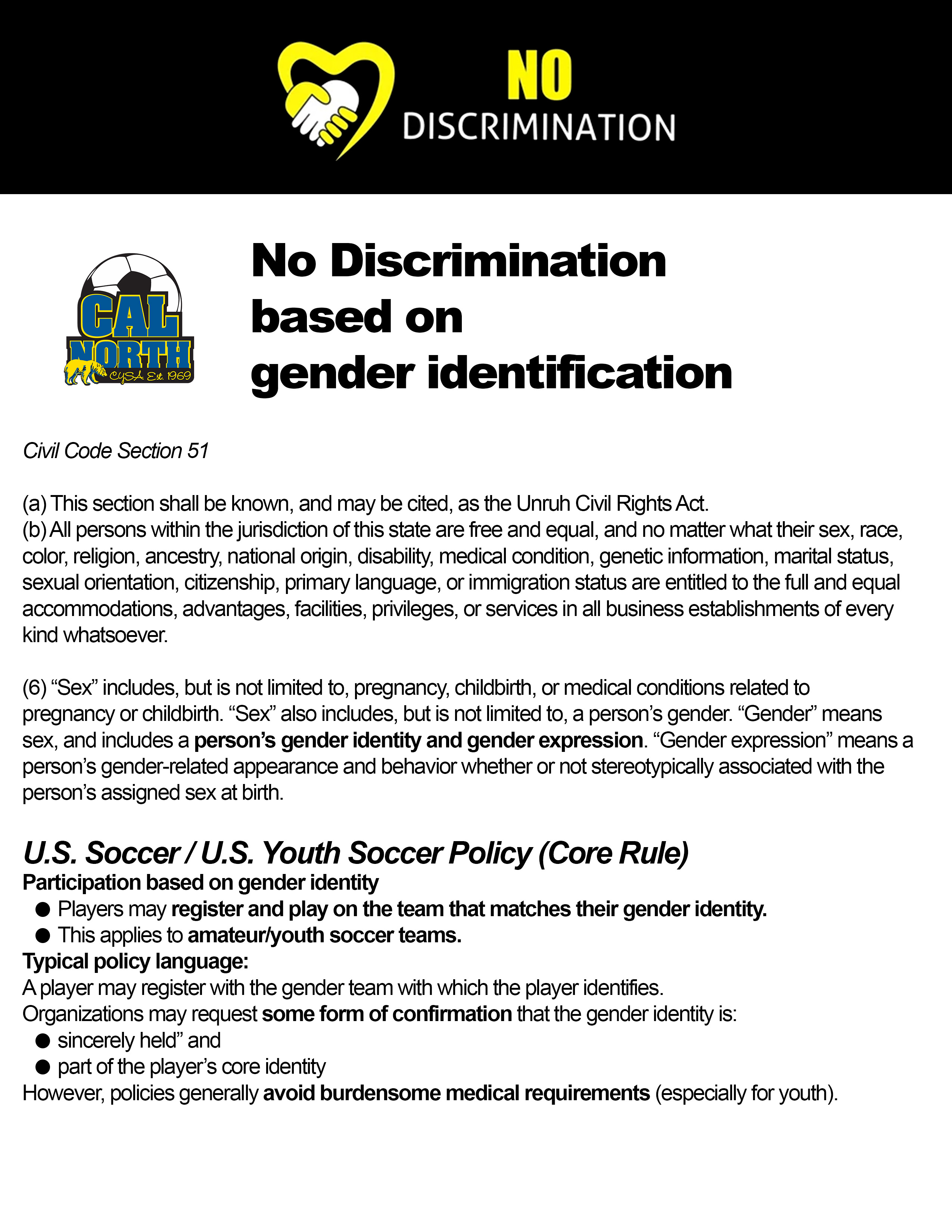 Read more on Civil Code Section 51: No discrimination based on gender identification in youth sports.